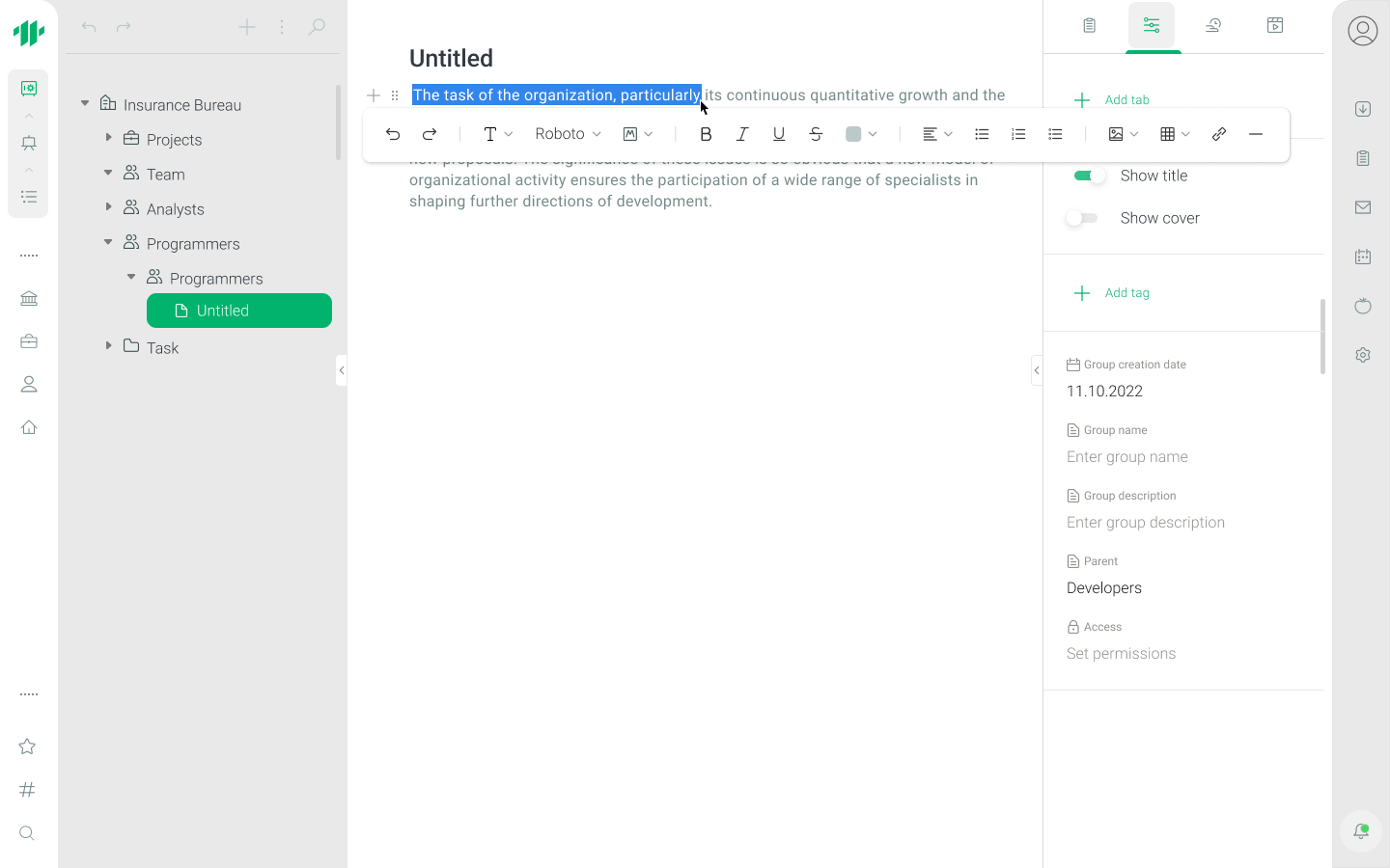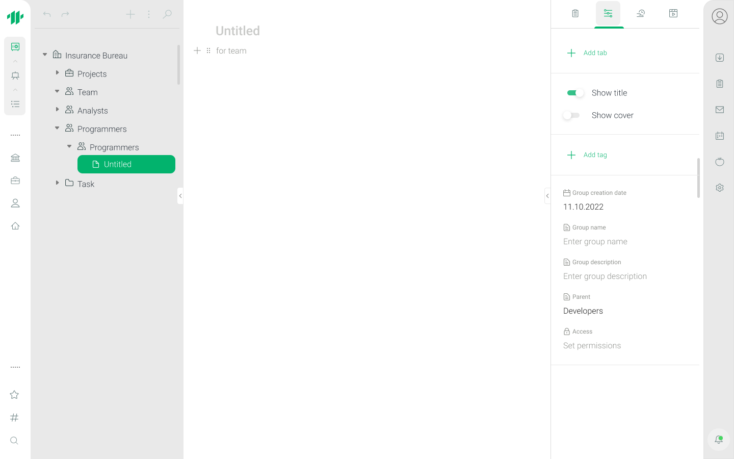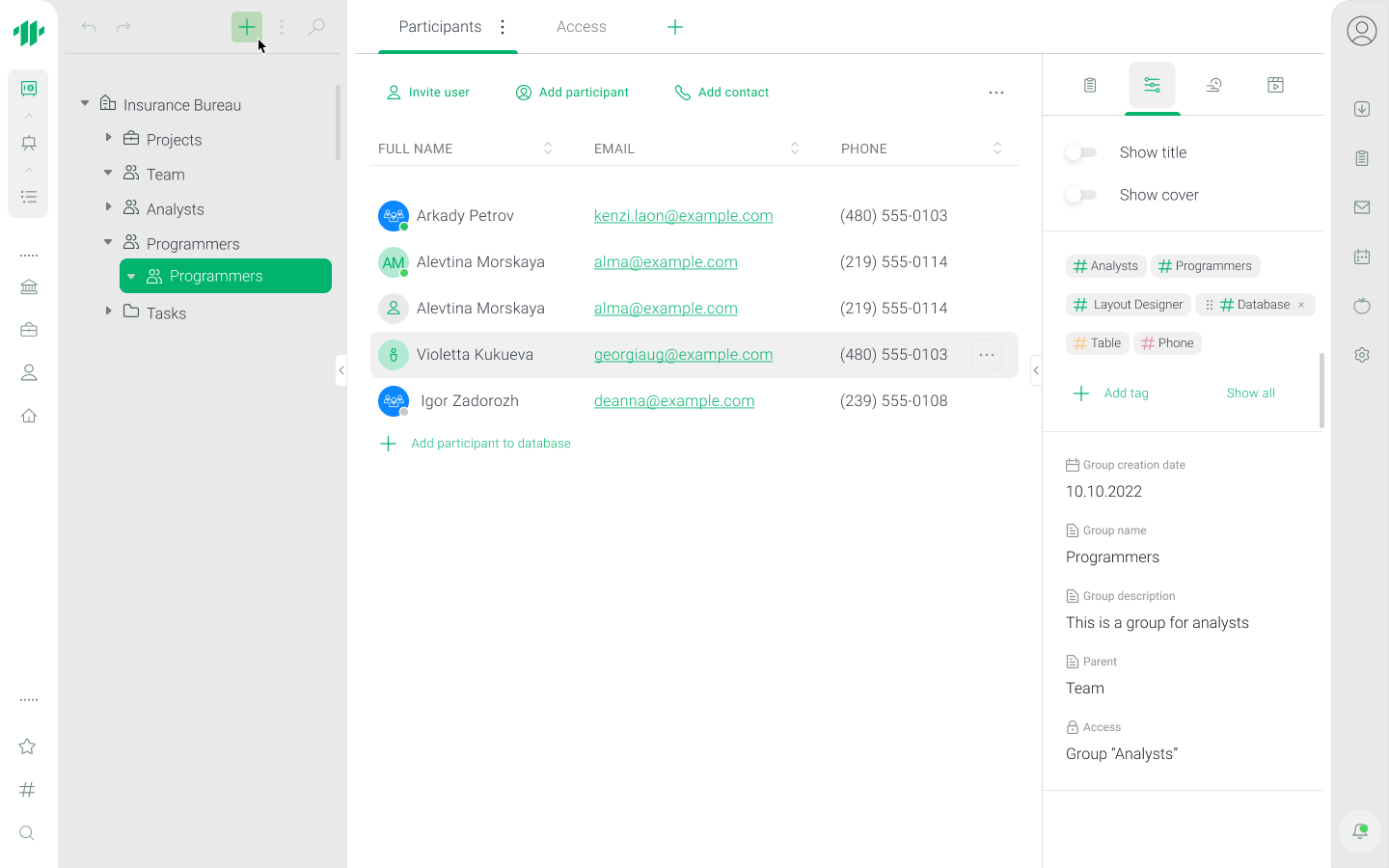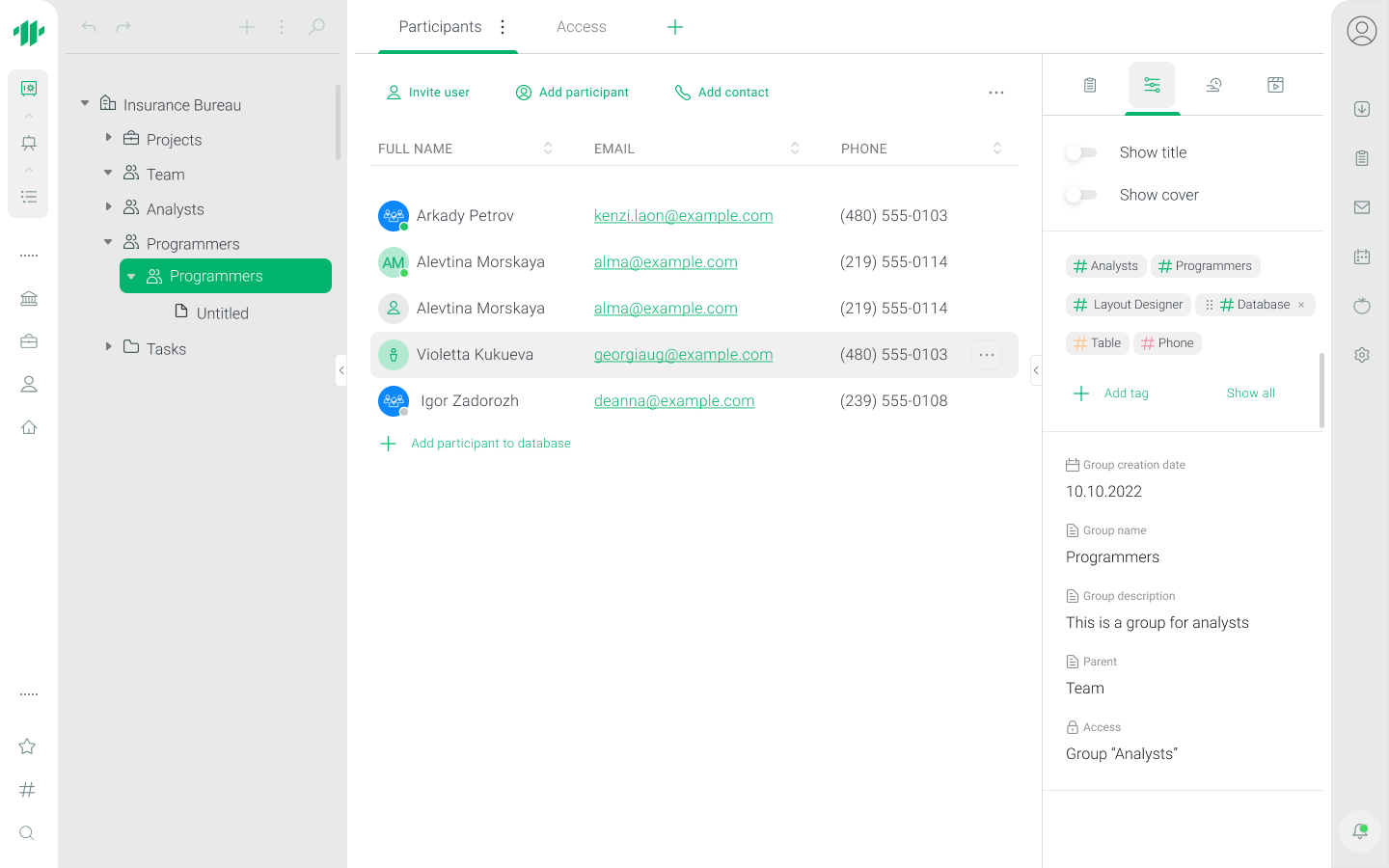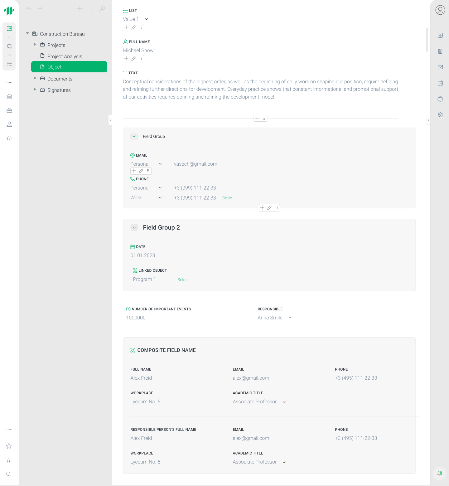 The system is aimed at employees who manage clients, projects, and internal processes daily. The goal was to make the CRM tree a convenient business tool: to manage objects, data, communication, and projects all in one place.